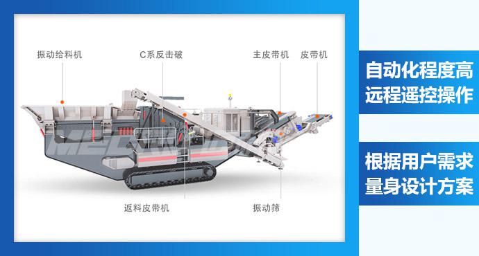 履带反击式破碎设备,常用作物料的粗碎或中、细碎处理。原始物料通过带有预筛分功能的震动给料机,小的物料被过滤,经由侧出皮带机直接卸料,大的物料则进入反击破的破碎腔,在破碎腔里充分破碎后,经由皮带机传送给其他设备进行下一步破碎,或者经由皮带机直接卸料,完成破碎作业。如果设备配置的有振动筛,则物料由反击破破碎后,通过振动筛,大的物料返回给料机,符合粒度要求的物料则通过卸料皮带直接卸料。